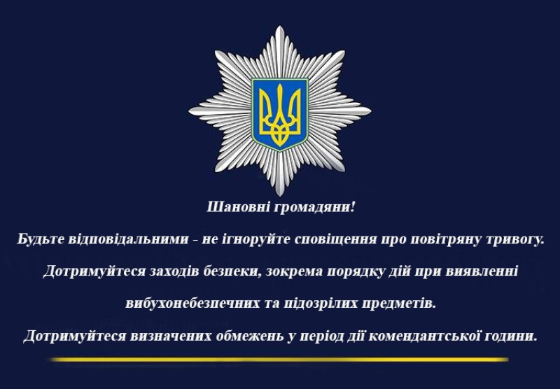 Шановні громадяни! Дотримуйтеся заходів безпеки, зокрема порядку дій при виявленні підозрілих і вибухонебезпечних предметів, режиму комендантської години.