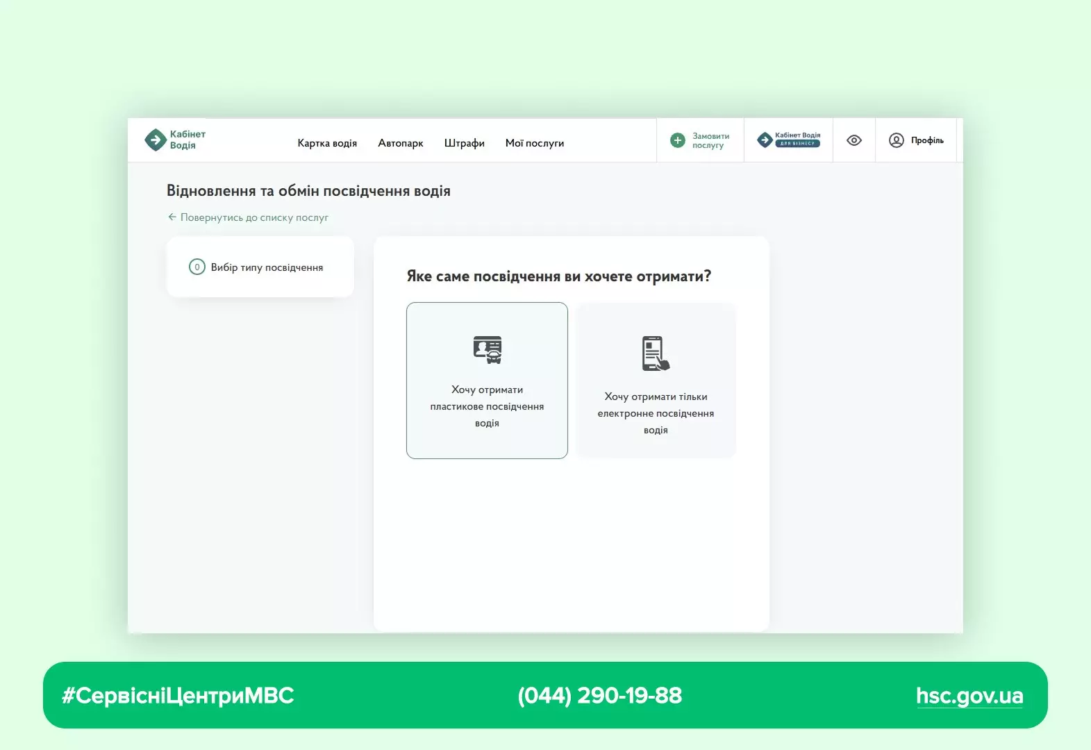 вибрати тип нового посвідчення водія: пластикове або електронне;