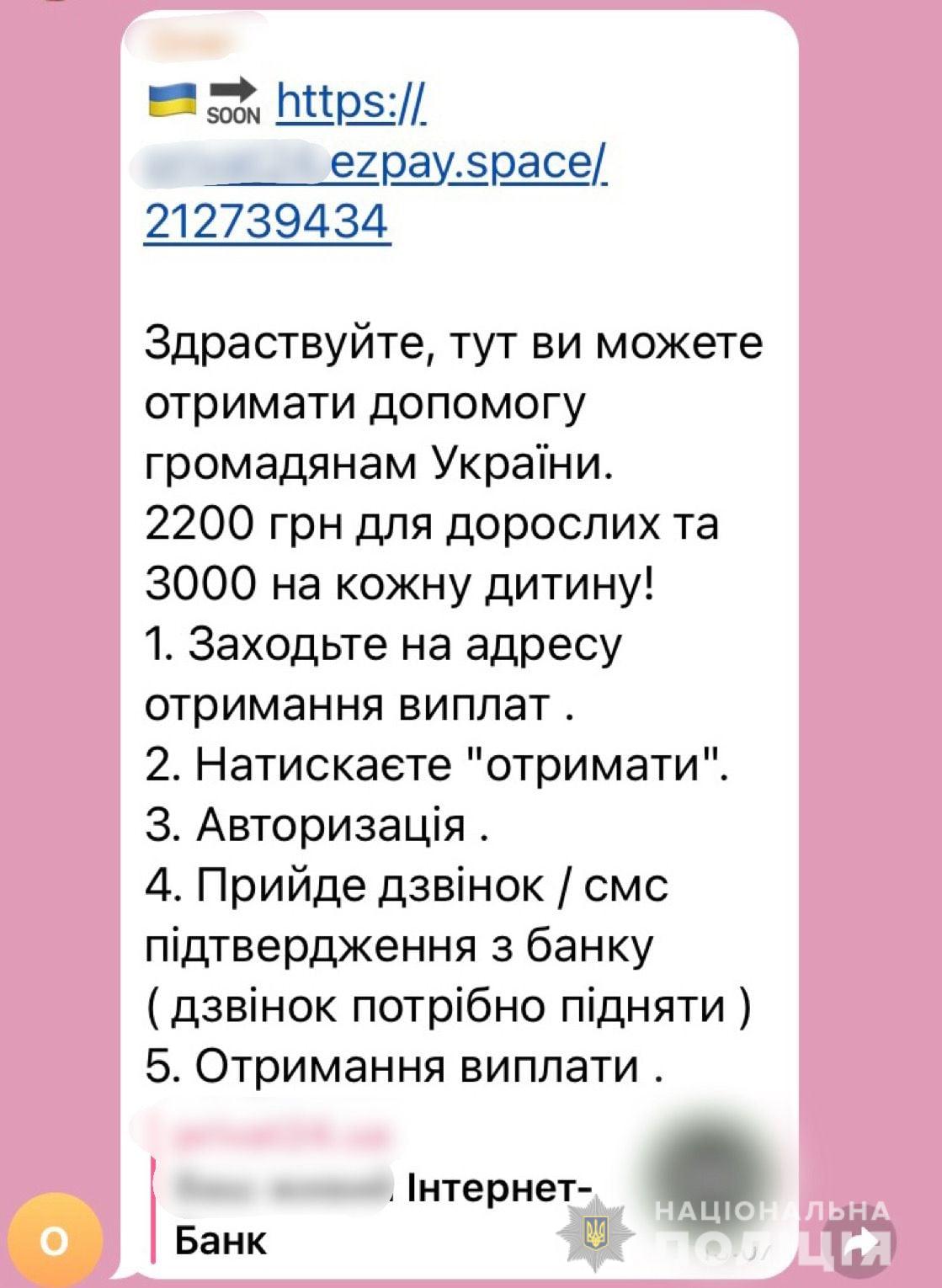 Правопорушники роблять розсилку SMS-повідомлень, де розповідають про виплату матеріальної допомоги вимушеним переселенцям. В повідомленні шахраї також вказують посилання на ресурс, де нібито можна подати заявку на отримання допомоги. За посиланням громадянам пропонується ввести персональні дані та номер банківської картки для зарахування грошей.