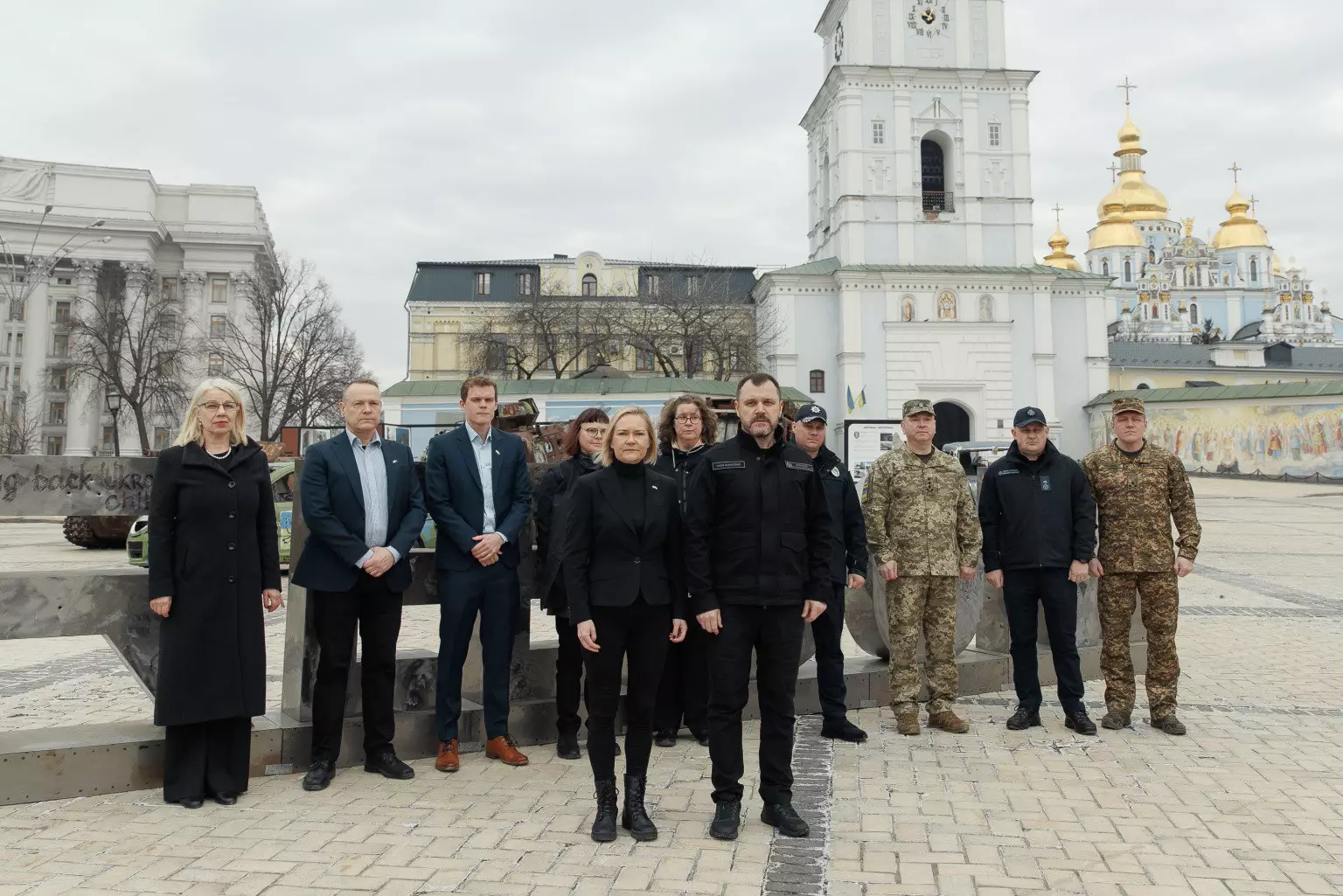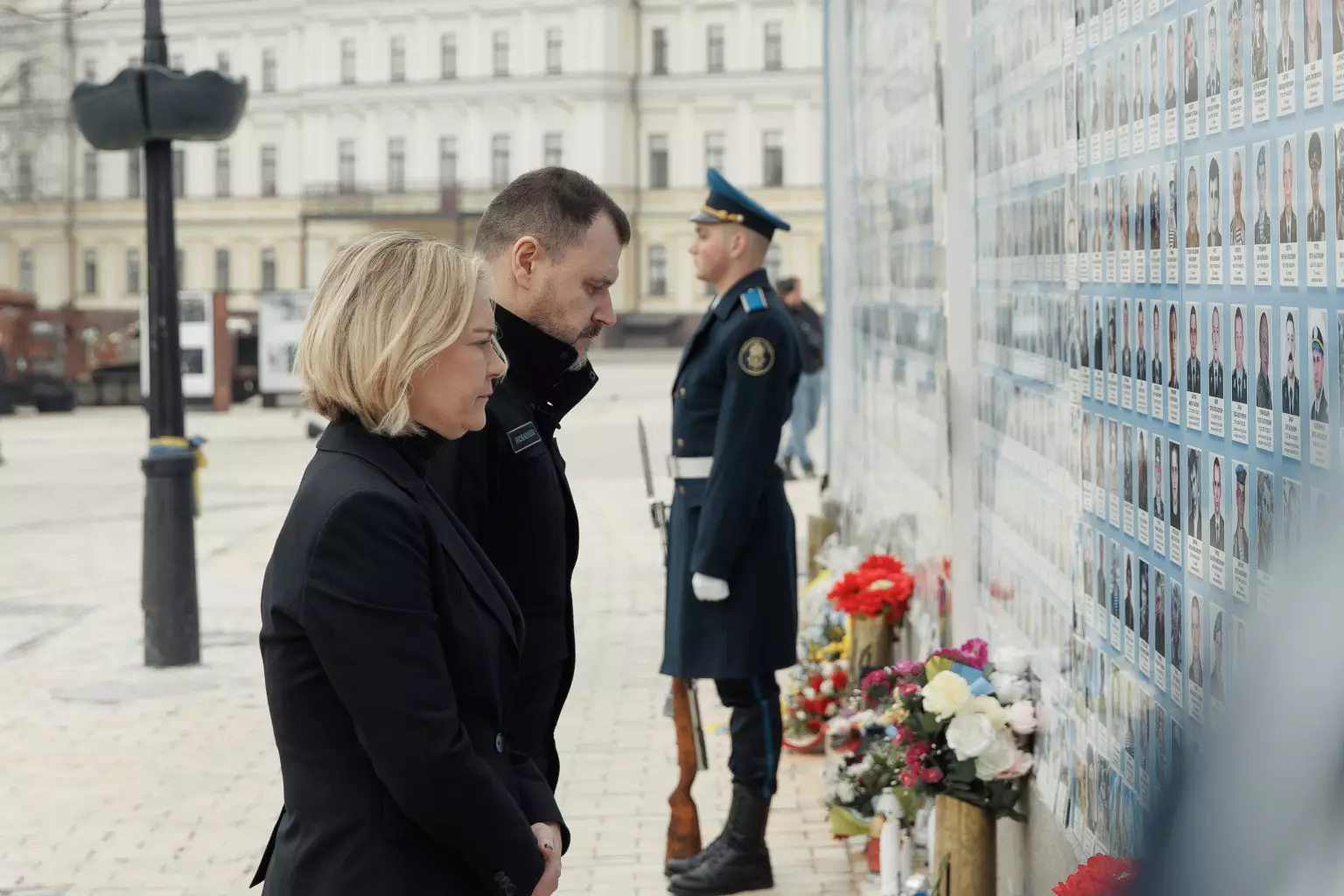 Далі фінська делегація на чолі з Марі Рантанен взяла участь у церемонії покладання квітів до Стіни пам’яті полеглих Героїв на Михайлівській площі у Києві.