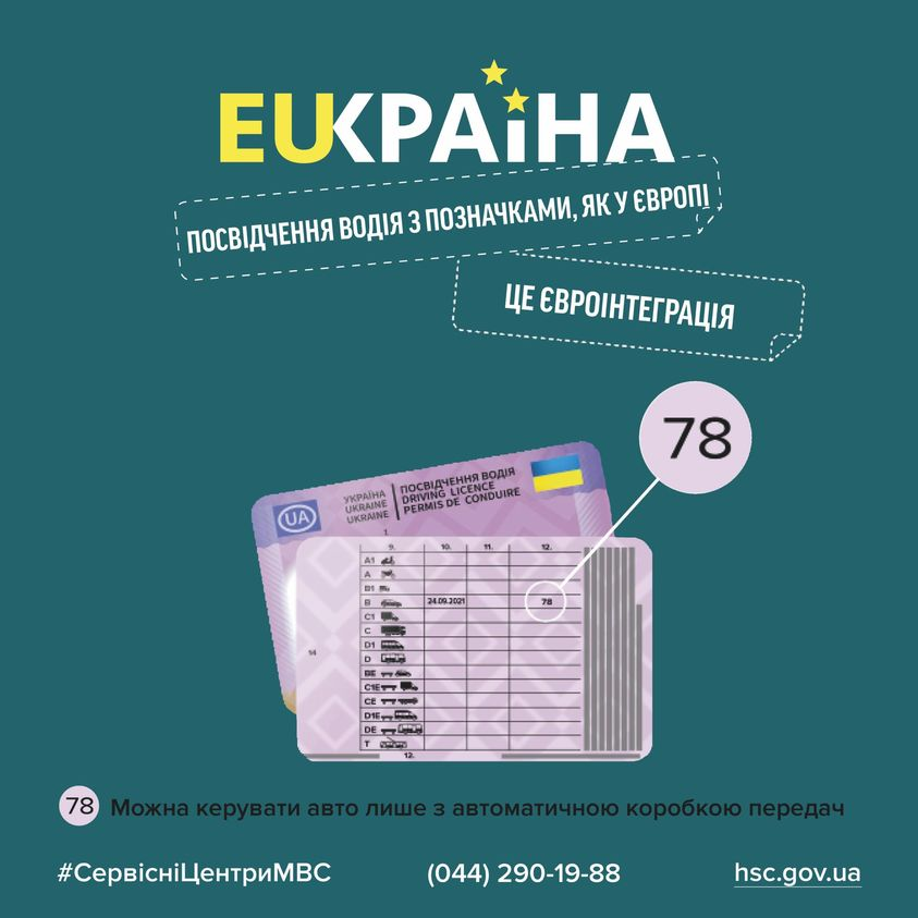 Нагадуємо, з кінця 2021 року в ГСЦ втілили ще одну новацію в національному посвідченні водія — адаптували його до європейського зразка. У документі фіксується відмітка у вигляді коду «78», якщо практичний іспит ви складали на транспортному засобі з автоматичною коробкою передач.