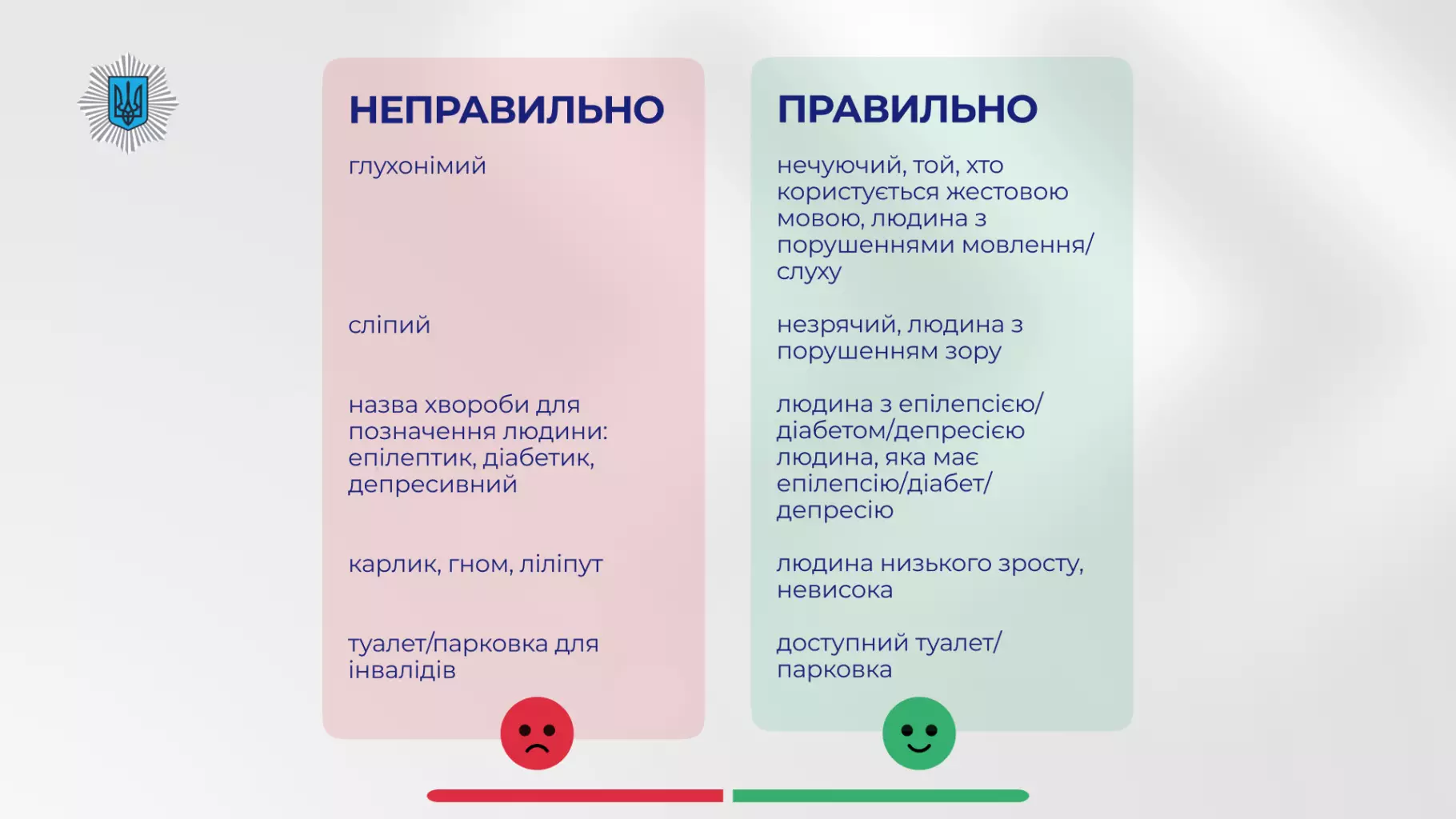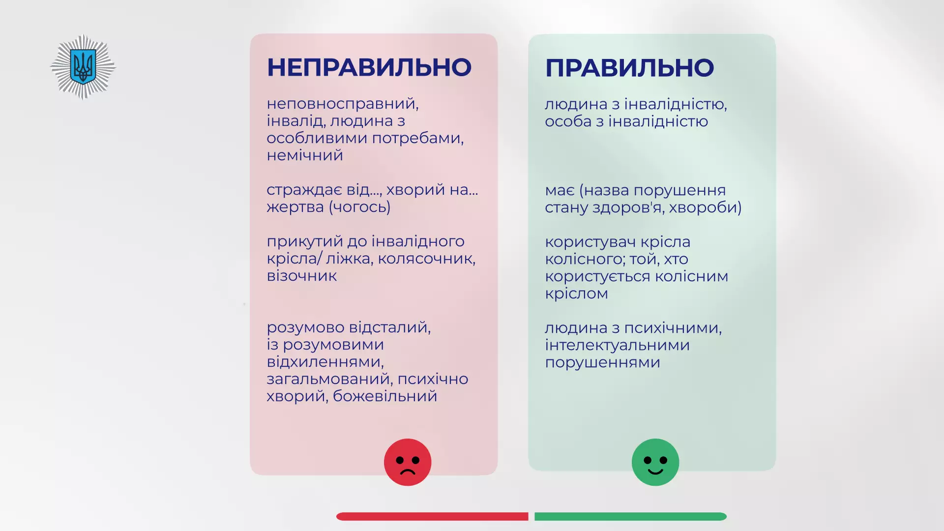 Уникайте мови жалю. Фрази на кшталт «страждає від» або «жертва» несуть негативний контекст, тому краще використовувати нейтральні вирази, як-от «живе з» або «має». Використання коректної термінології у спілкуванні з людьми з інвалідністю дозволяє уникати стереотипів, дискримінації, підтримувати рівність і виявляти повагу до кожної особистості.