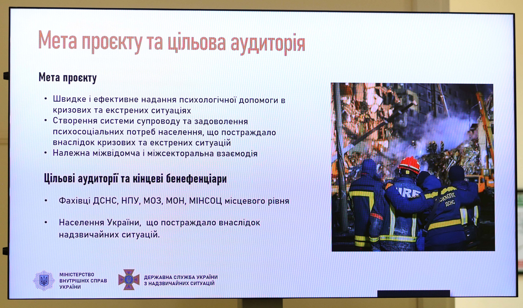 «Після кожної надзвичайної ситуації постраждалі та їхні родичі перебувають у важких психологічних станах.Кількість таких людей, на жаль, росте. На місцях надзвичайних ситуацій завжди працюють ДСНС та НПУ. Їхнє основне завдання - ліквідація наслідків і надання первинної допомоги. Безумовно, першими на місцях подій надають психологічну допомогу постраждалим фахівці психологічної служби ДСНС. Втім, люди в таких ситуаціях потребують і подальшого супроводу та психосоціальної підтримки», - зазначила Катерина Павліченко.