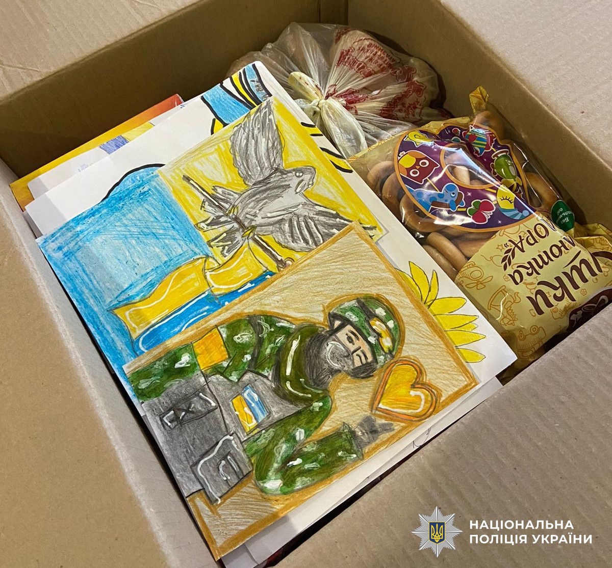 Дитячі малюнки долучили до пакувань зі смаколиками та речами першої необхідності, які волонтери передали захисникам і захисницям.