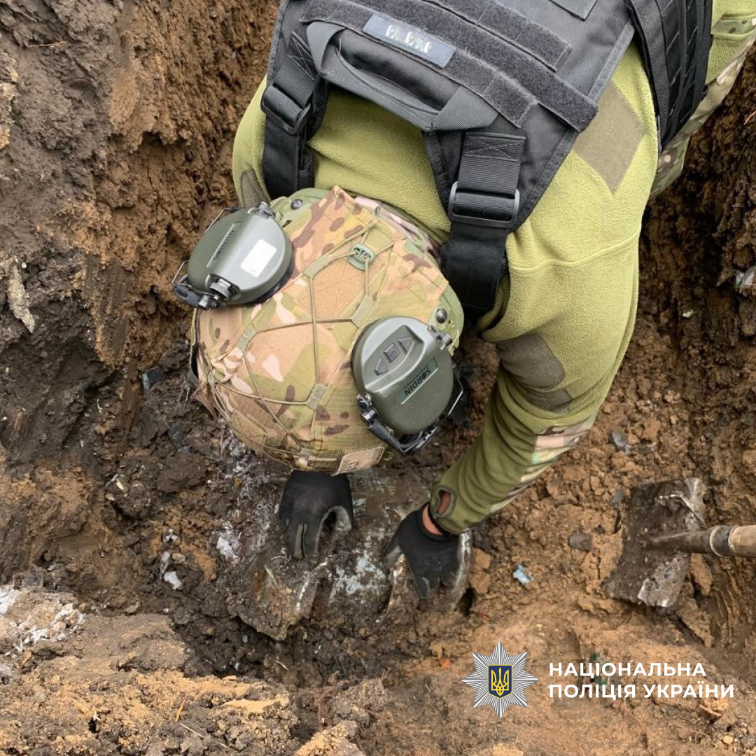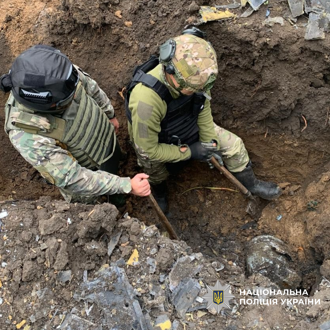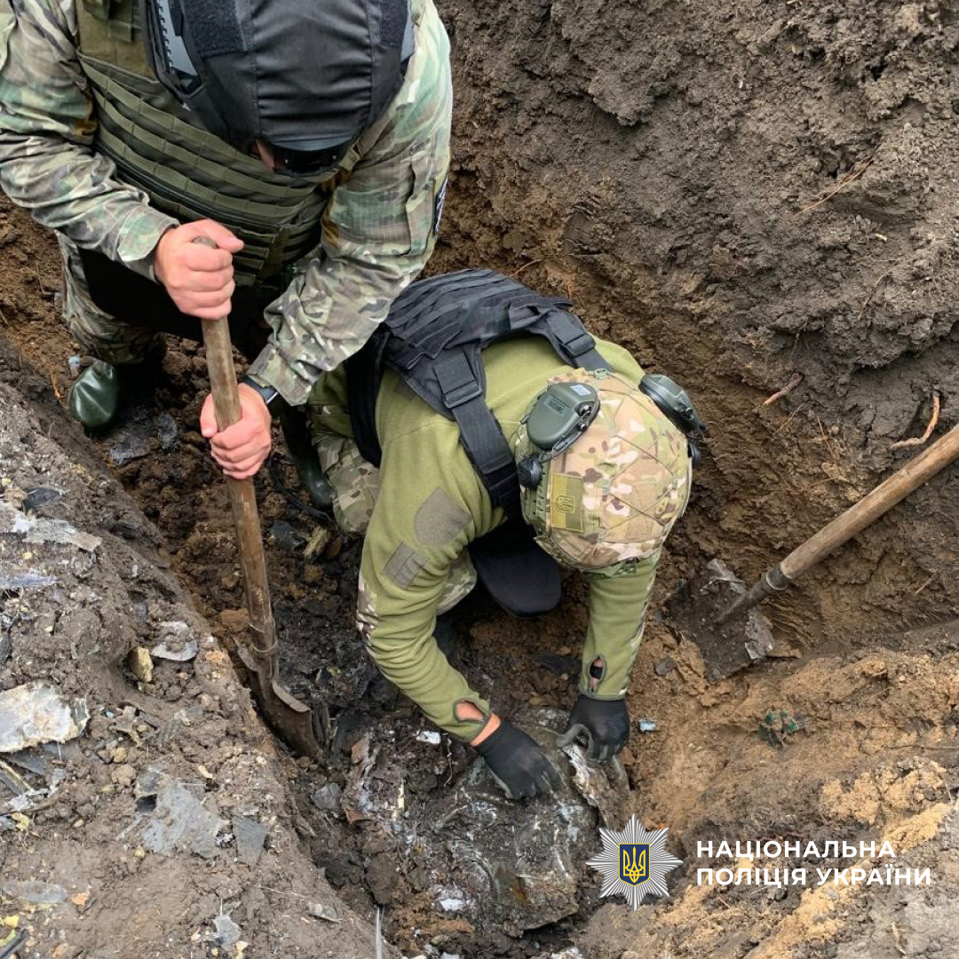 На місце події прибули фахівці відомчої вибухотехнічної служби та обстежили бойову частину БпЛА вагою понад 50 кг, яка заглибилась у землю та не здетонувала.