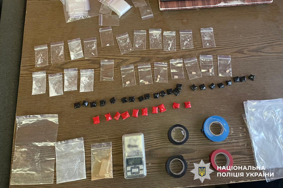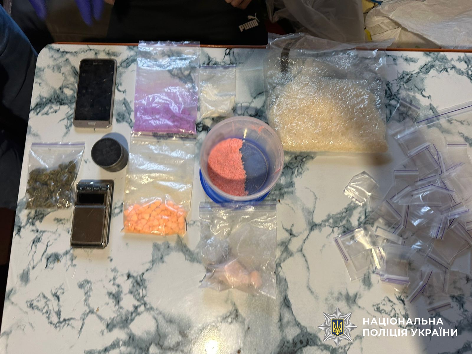 Із залученням кінологів зі службовими собаками та силової підтримки спецпідрозділу, правоохоронці провели низку обшуків. У результаті виявили та вилучили пів кілограма психотропних речовин, 150 пігулок екстазі, понад 60 «закладок» та більше 200 тисяч гривень, а також канабіс, приладдя для фасування, зіп-пакети, ізолюючі стрічки та інші речові докази.