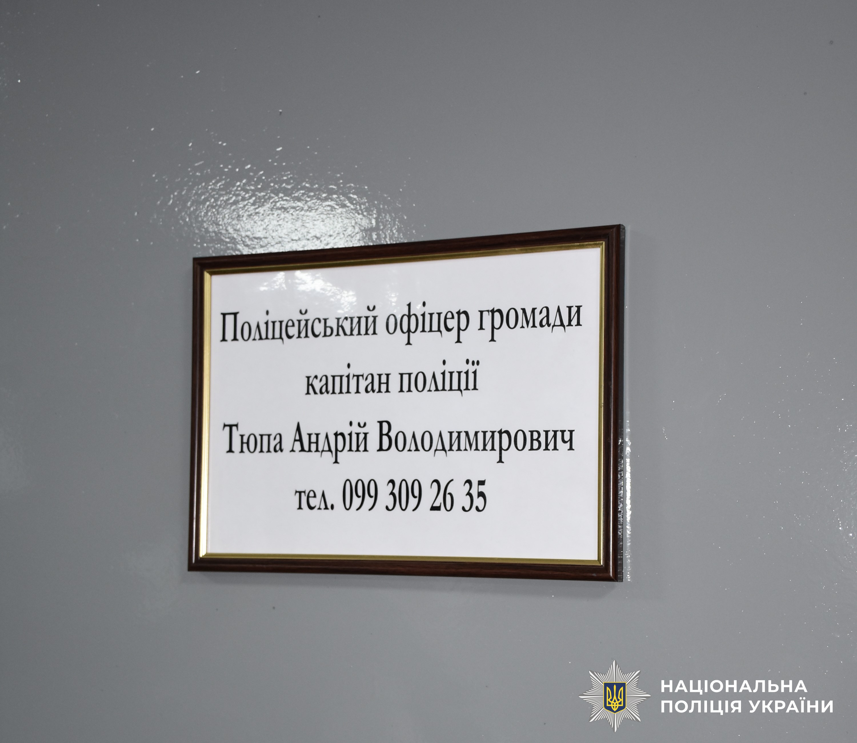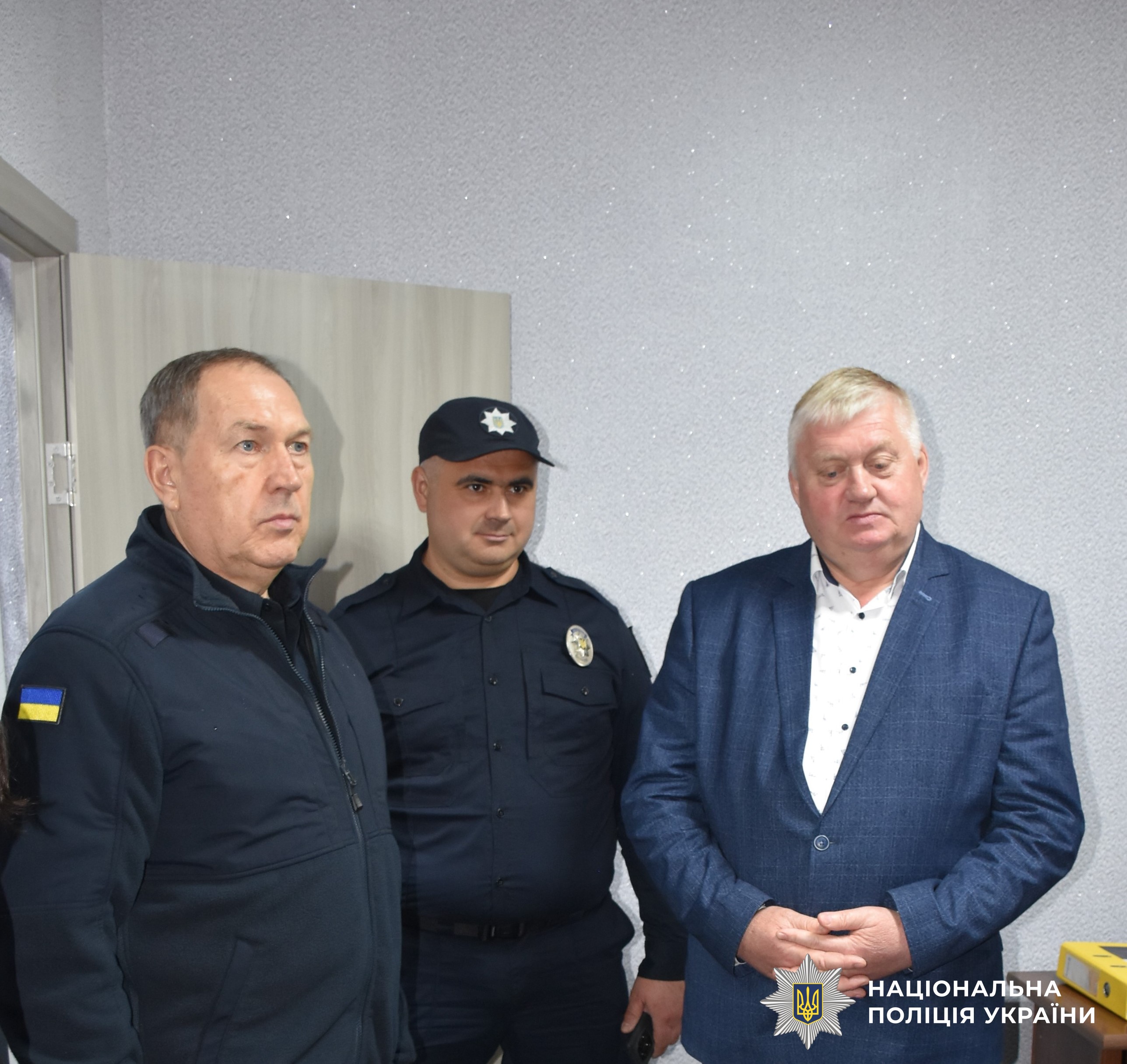 Станція функціонуватиме поряд із центром надання адміністративних послуг та місцевим ФАПом. Присутні оглянули службове приміщення, де працюватиме поліцейський офіцер громади Андрій Тюпа. Він опікуватиметься безпекою мешканців селища Знам’янка Друга та села Водяного.