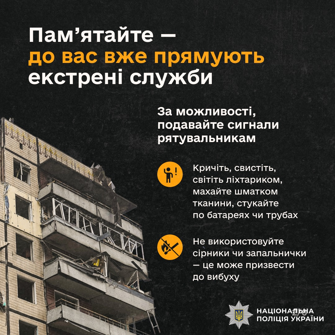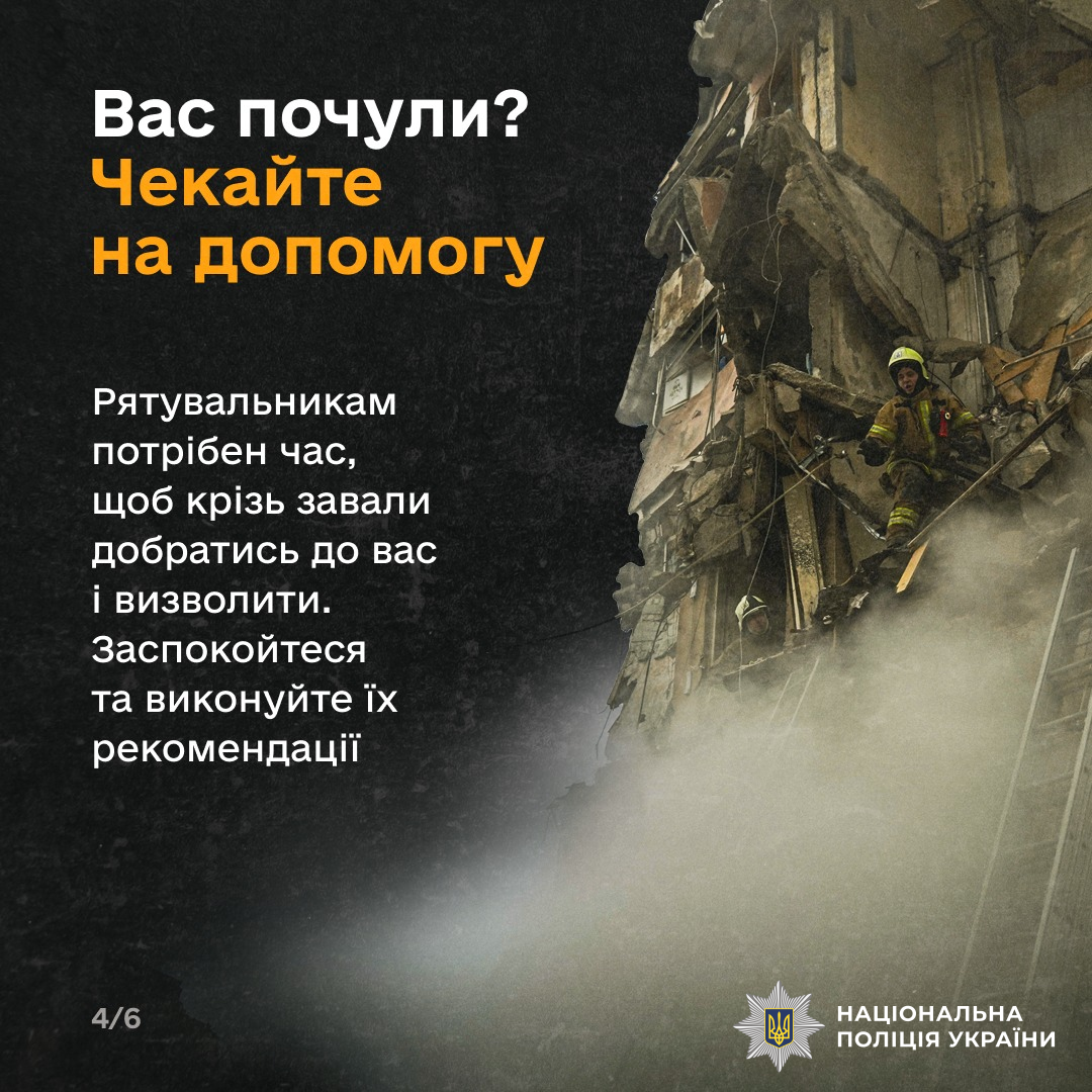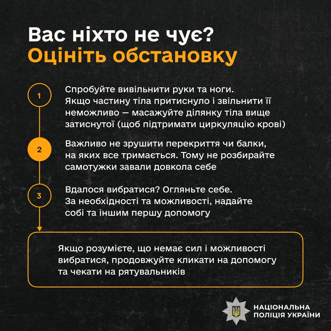 - Рятувальникам потрібен час, щоб крізь завали добратись до вас і визволити. Заспокойтеся та виконуйте їх рекомендації.