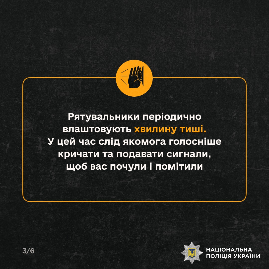 - Рятувальники періодично влаштовують хвилину тиші. У цей час слід якомога голосніше кричати та подавати сигнали, щоб вас почули і помітили.