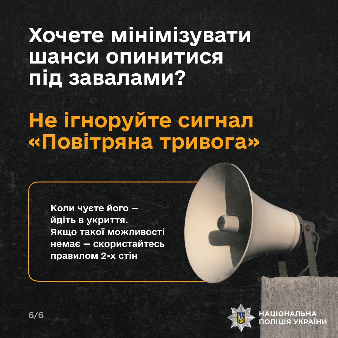 Аби мінімізувати шанси опинитися під завалами, не ігноруйте сигнал "Повітряна тривога". Негайно прямуйте до укриття. Якщо такої можливості немає - скористайтесь правилом 2-х стін.
