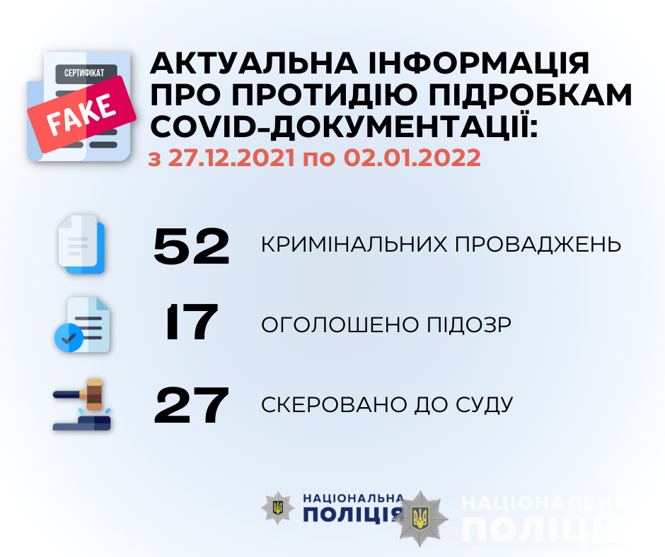 Наразі поліцейські скерували до суду 27 обвинувальних актів за фактами підроблення та використання COVID-документів.