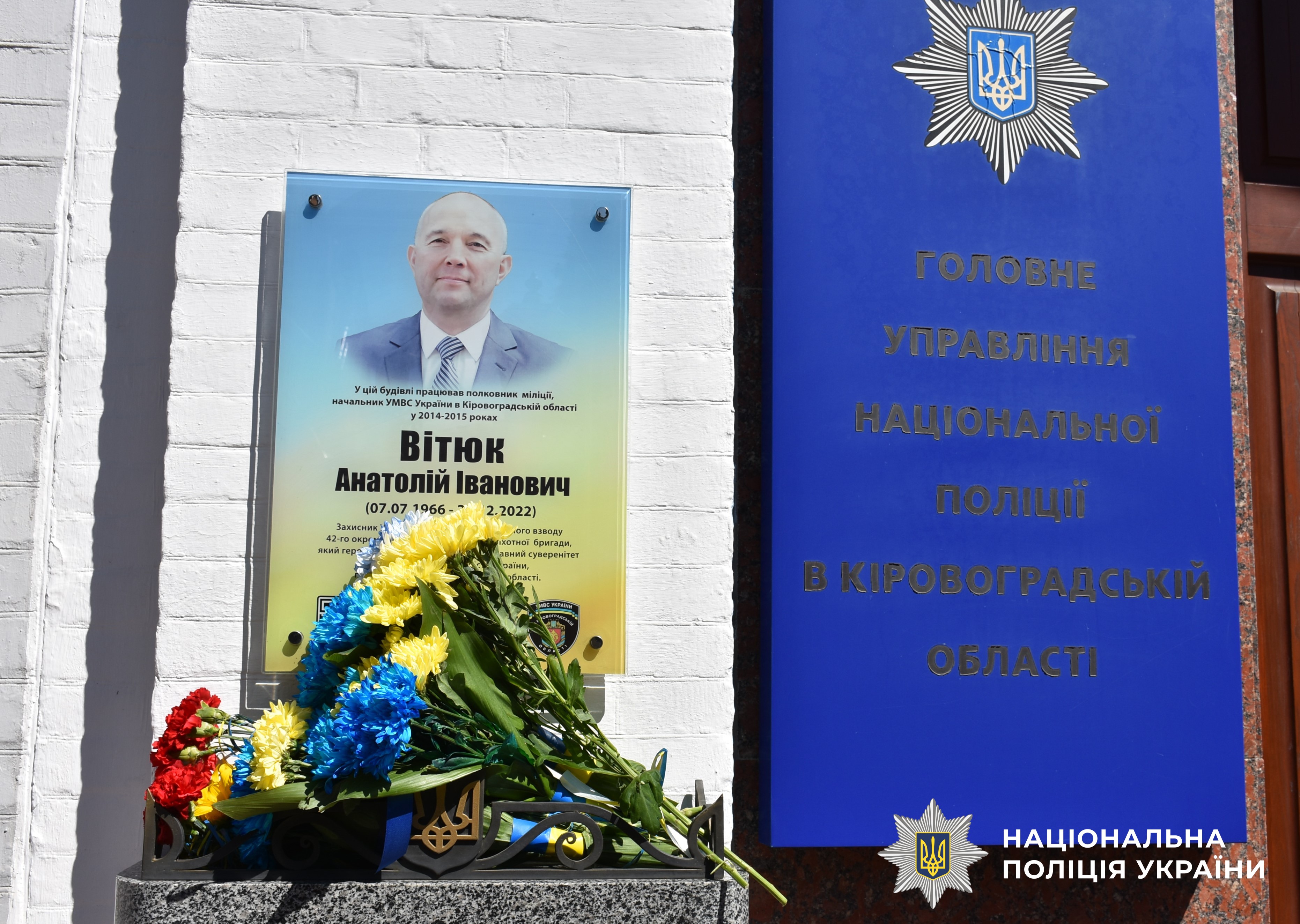 У День пам’яті керівник поліції області Андрій Дуброва та його заступник Артем Солтан разом із дружиною загиблого поклали квіти до меморіальної дошки Анатолію Вітюку, який очолював відомство у 2014-2015 роках. Він загинув на Донеччині у боях під Бахмутом у 2022 році.