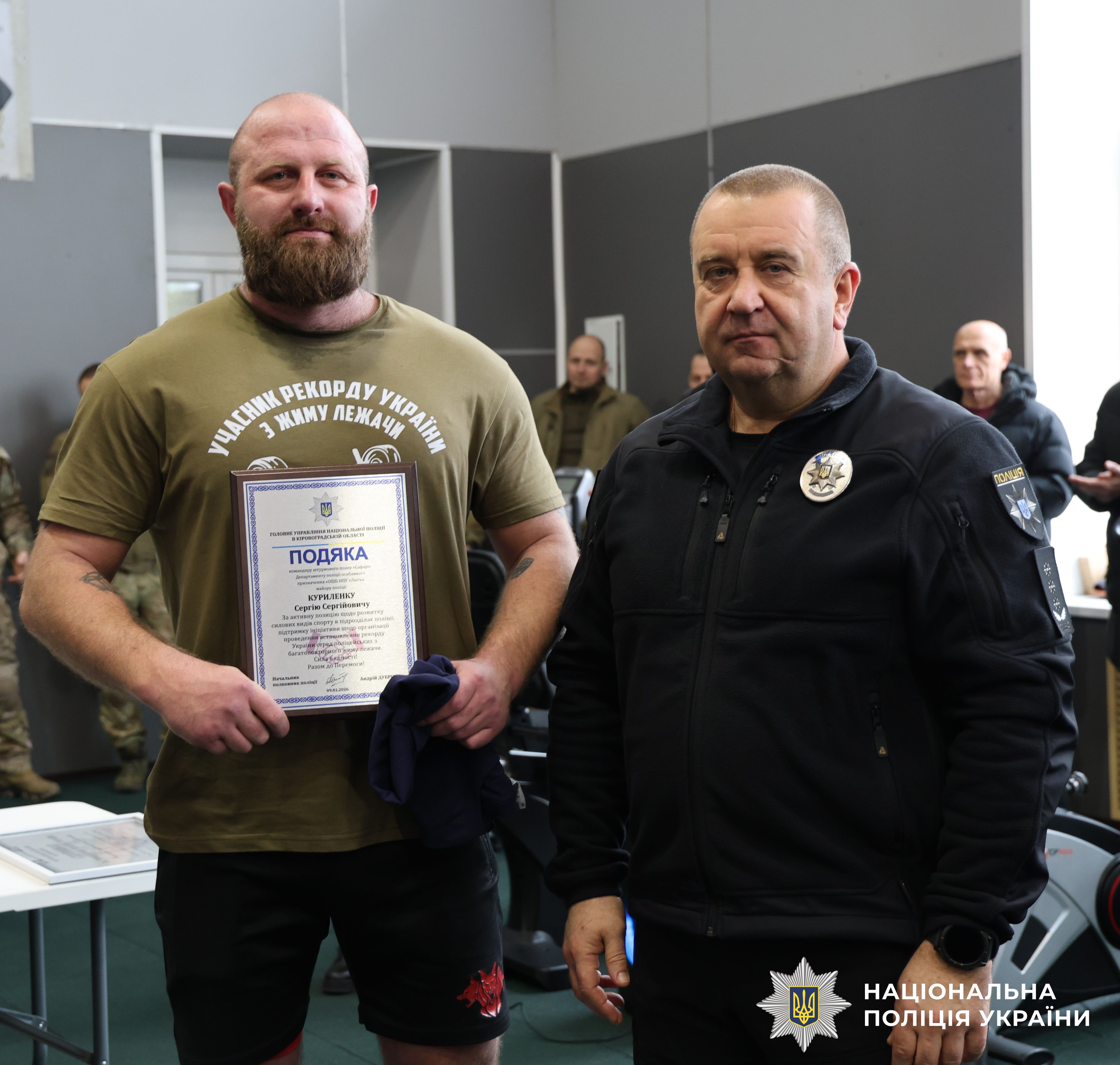Сьогодні у спортивній залі Головного управління Національної поліції в Кіровоградській області відбувся спортивно-масовий та фізкультурно-оздоровчий захід зі встановлення рекорду України з багатоповторного жиму лежачи. Захід присвятили пам’яті полеглих працівників Національної поліції України, які загинули, захищаючи державу під час російсько-української війни.