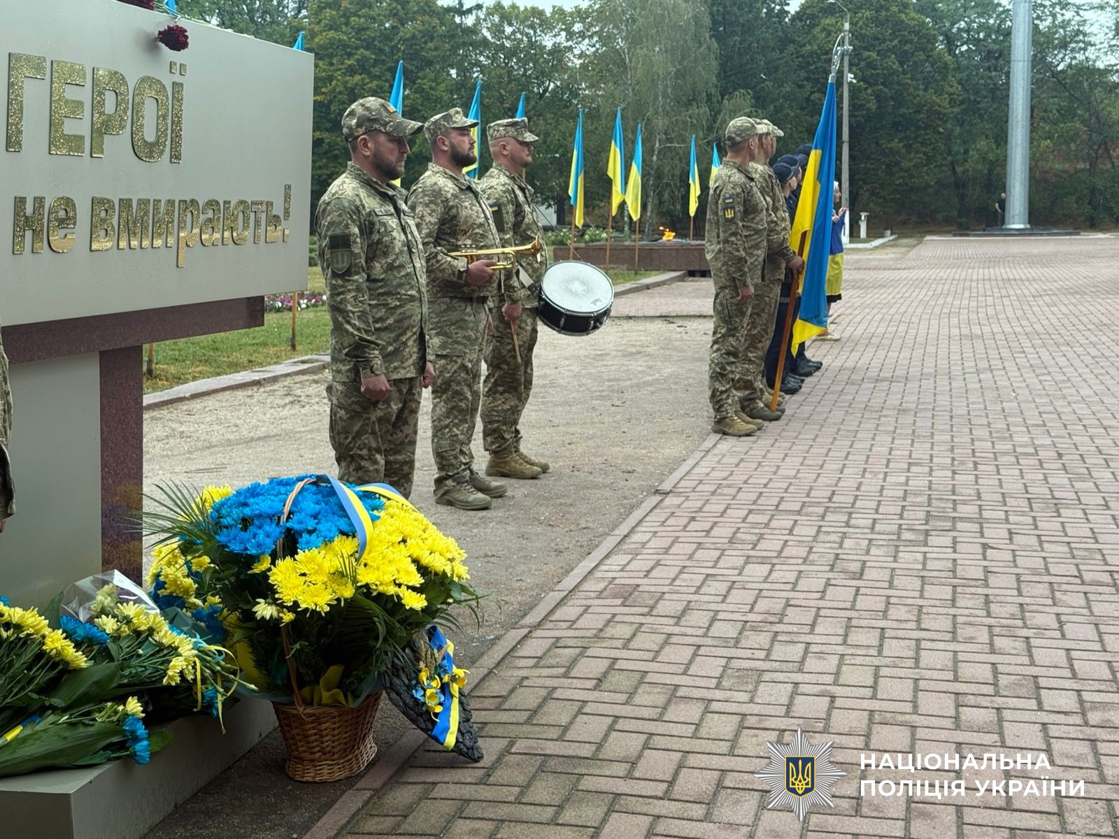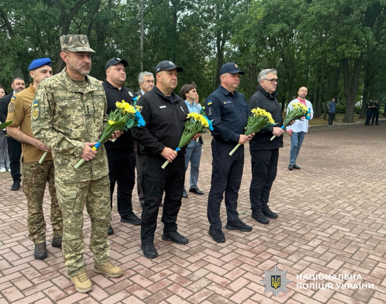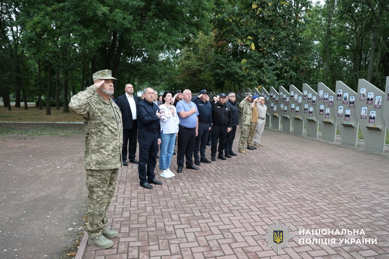 Правоохоронці поклали квіти до пам'ятних знаків та вшанували загиблих хвилиною мовчання, а також взяли участь у церемонії підняття Державного Прапора України.