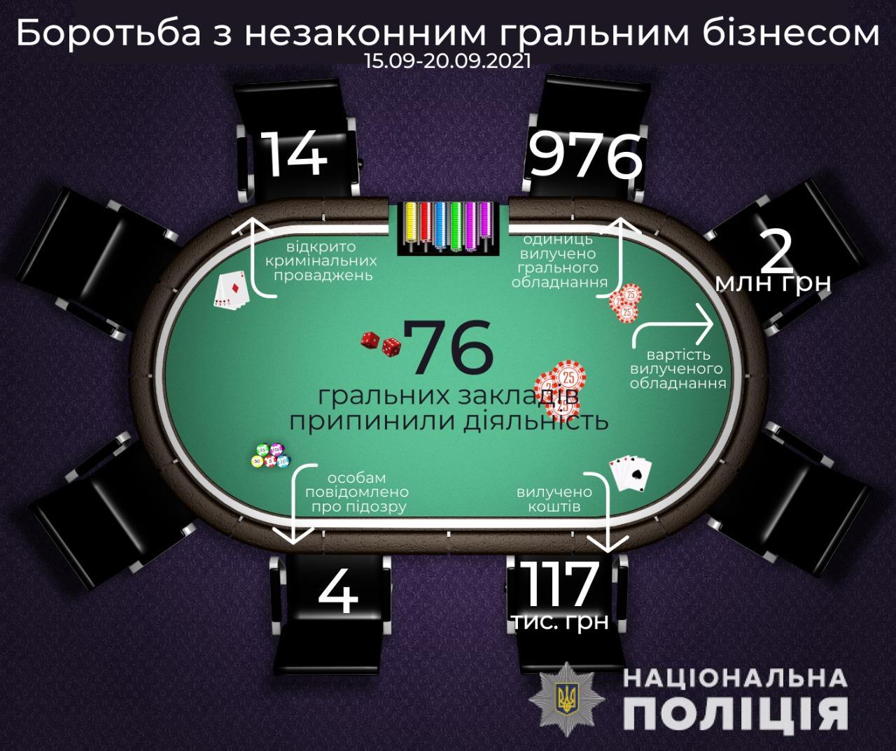 За фактами незаконної діяльності з організації або проведення азартних ігор, лотерей (стаття 203-2 Кримінального кодексу України) відкрито 14 кримінальних проваджень та вже 4 особи отримали підозри. З підпільних гральних закладів поліцейські вилучили 976 одиниць грального обладнання загальною вартістю понад два мільйони гривень та 117 тис. грн готівки, отриманої від ставок. Найбільше таких закладів було виявлено на Дніпропетровщині - 14, Київщині - 13 та у місті Києві -11.