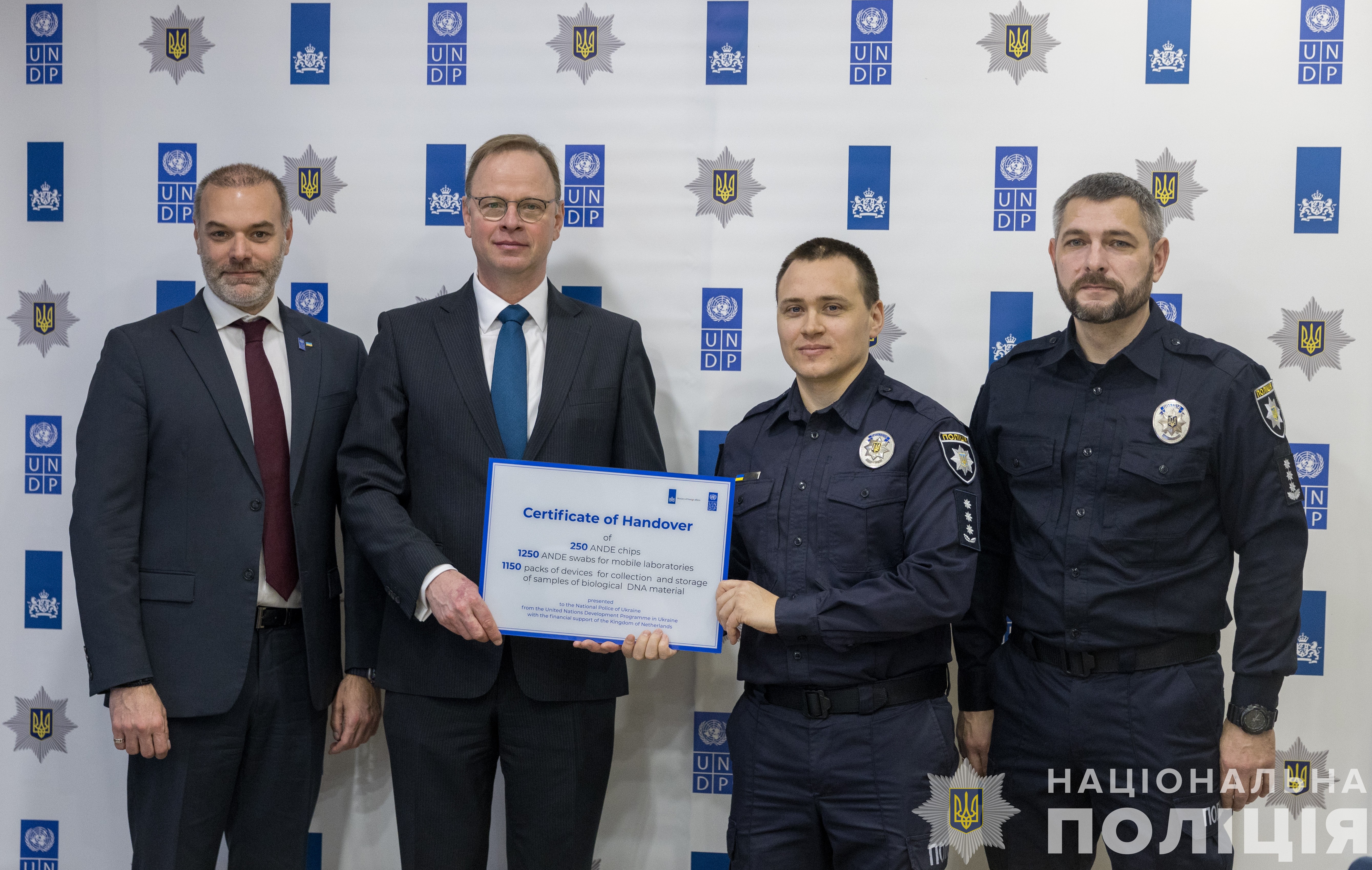 Програма розвитку Організації Об’єднаних Націй в Україні за фінансової підтримки Уряду Нідерландів передала Національній поліції України 250 чіпів ANDE, 1,250 аплікаторів ANDE та 1,150 наборів пристроїв для збору та зберігання зразків біологічного матеріалу ДНК.