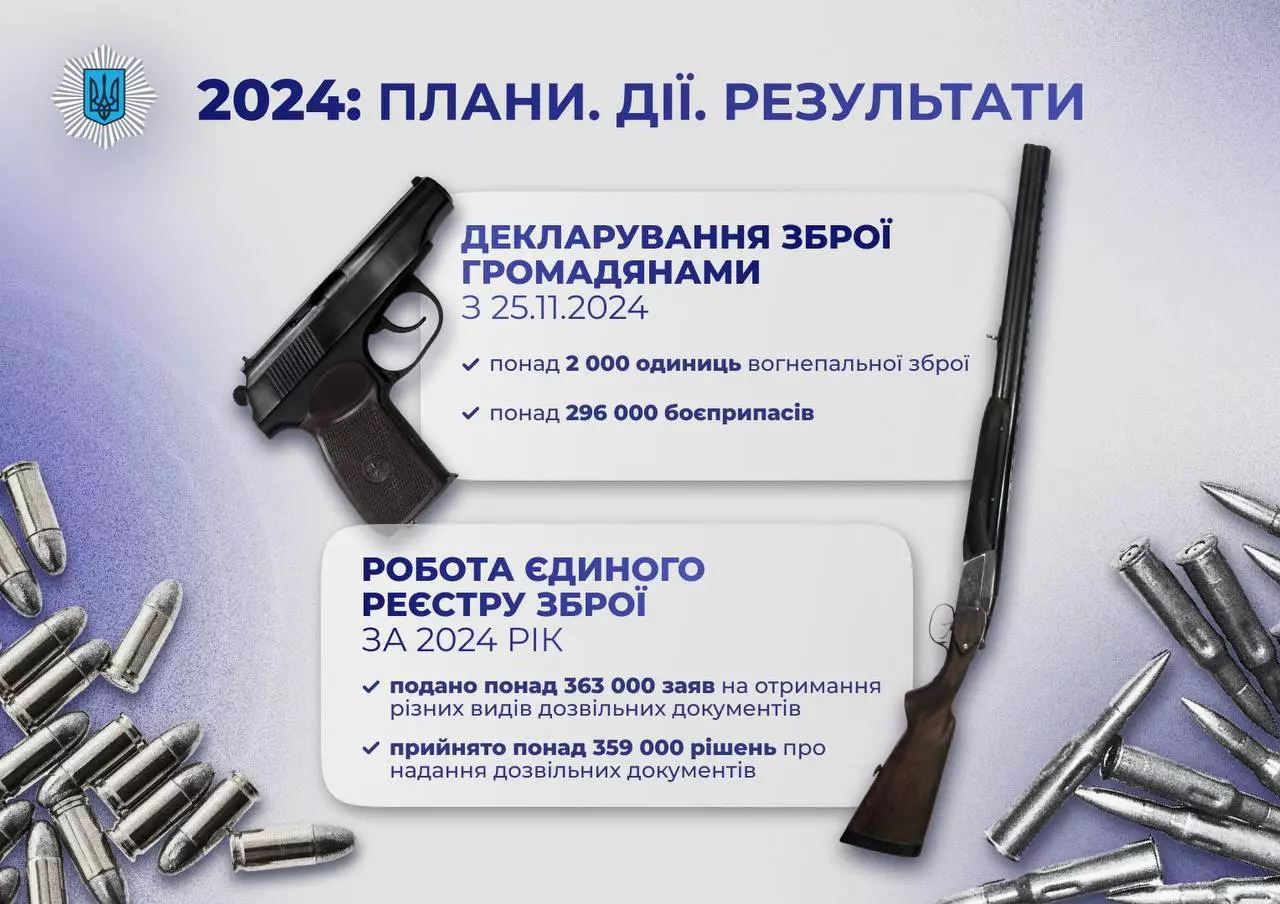 Ще один важливий інструмент — Єдиний реєстр зброї, який працює вже півтора року. У 2024 році громадяни подали майже 363 000 заяв на отримання різних видів дозвільних документів.