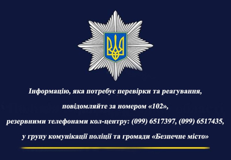 Також нагадуємо про можливість звернутися до поліції за резервними номерами кол-центру: (099) 6517397, (099) 6517435, або надати інформацію у групу «Безпечне місто» у месенджері Телеграм - https://t.me/+WFDNMUScH-N3C2iL.