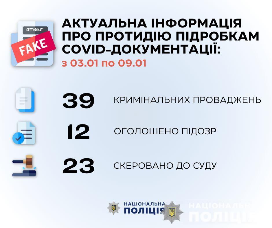 Наразі поліцейські скерували до суду 23 обвинувальні акти за фактами підроблення та використання COVID-документів.