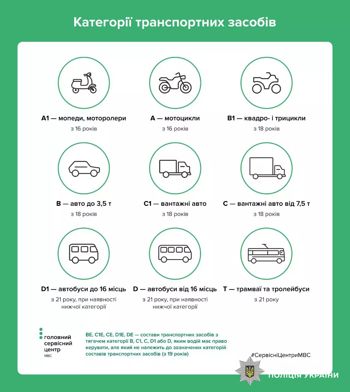 - категорії ВЕ, С1Е та СЕ - состави транспортних засобів з тягачем категорії В, С1, С.
