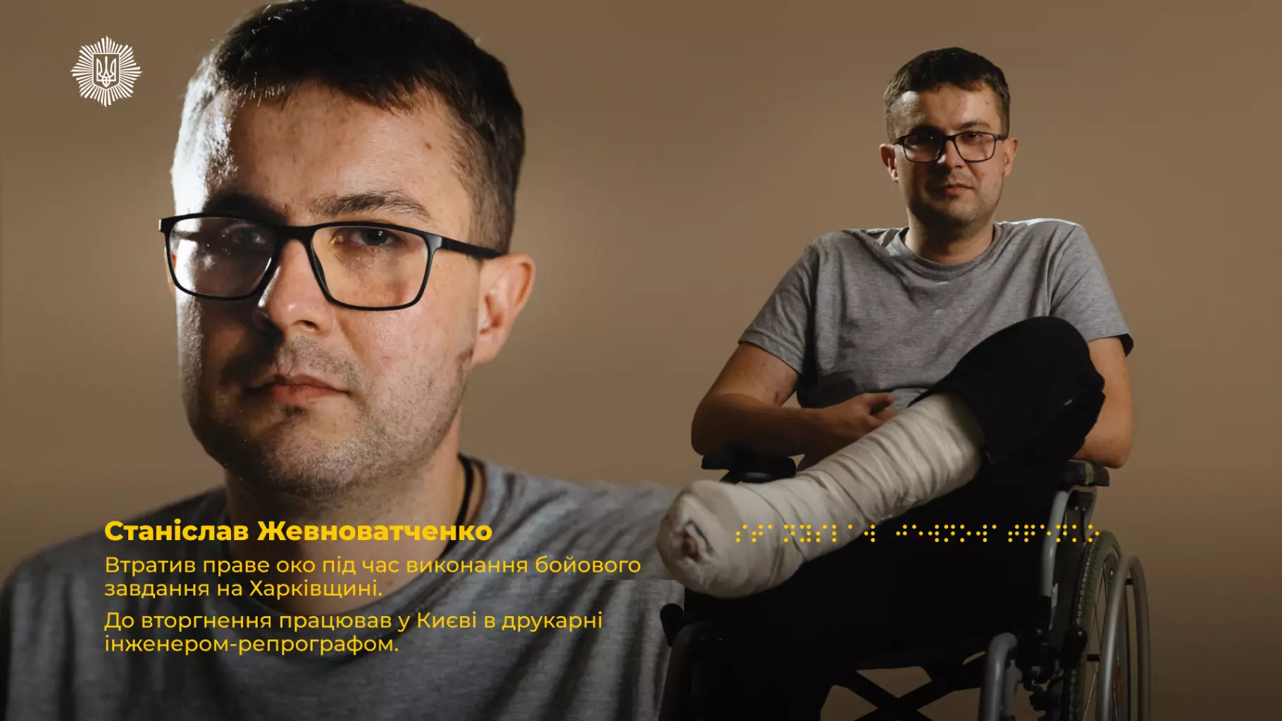Серед тих, хто наразі вчиться жити у невізуальному світі і нацгвардієць Станіслав Жевноватченко. Чоловік до вторгнення російських окупантів працював інженером-репрографом у київській друкарні та разом із дружиною виховували сина. Проте, через російську агресію Станіславу довелось стати на захист рідного дому, так він опинився у лавах Національної гвардії України. Під час виконання бойового завдання на Харківщині, чоловік втратив не лише можливість бачити на праве око, а й численні травми.
