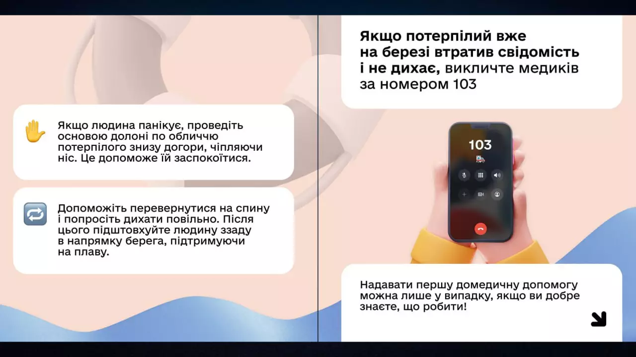 - Якщо потерпілий вже на березі втратив свідомість і не дихає, викличте медиків за номером 103.