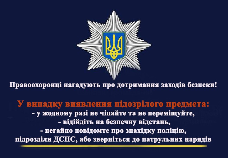 У разі виявлення підозрілих предметів – не чіпати та не переміщувати, відійти на безпечну відстань та негайно повідомити про знахідку поліцію, підрозділи ДСНС або звернутися до патрульних нарядів.