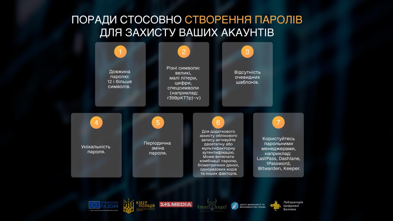 Для створення паролів різної складності також можна використовувати сервіси генерації паролів, як-от на сайті кіберполіції: https://cyberpolice.gov.ua/generate-password/.