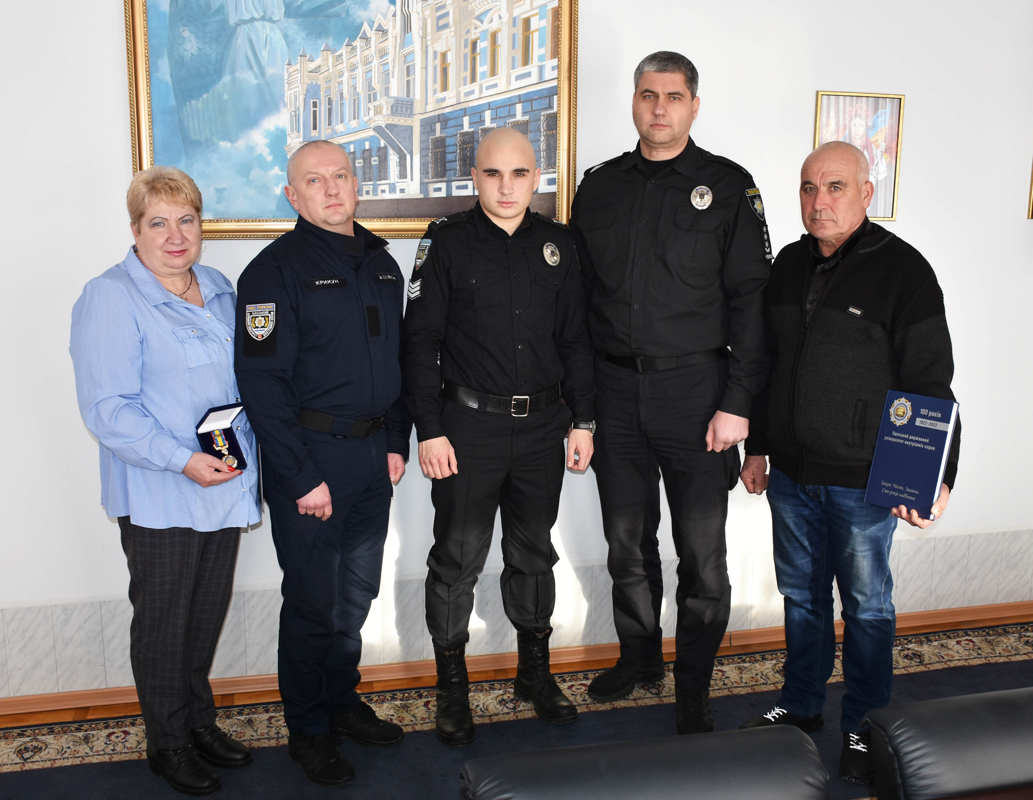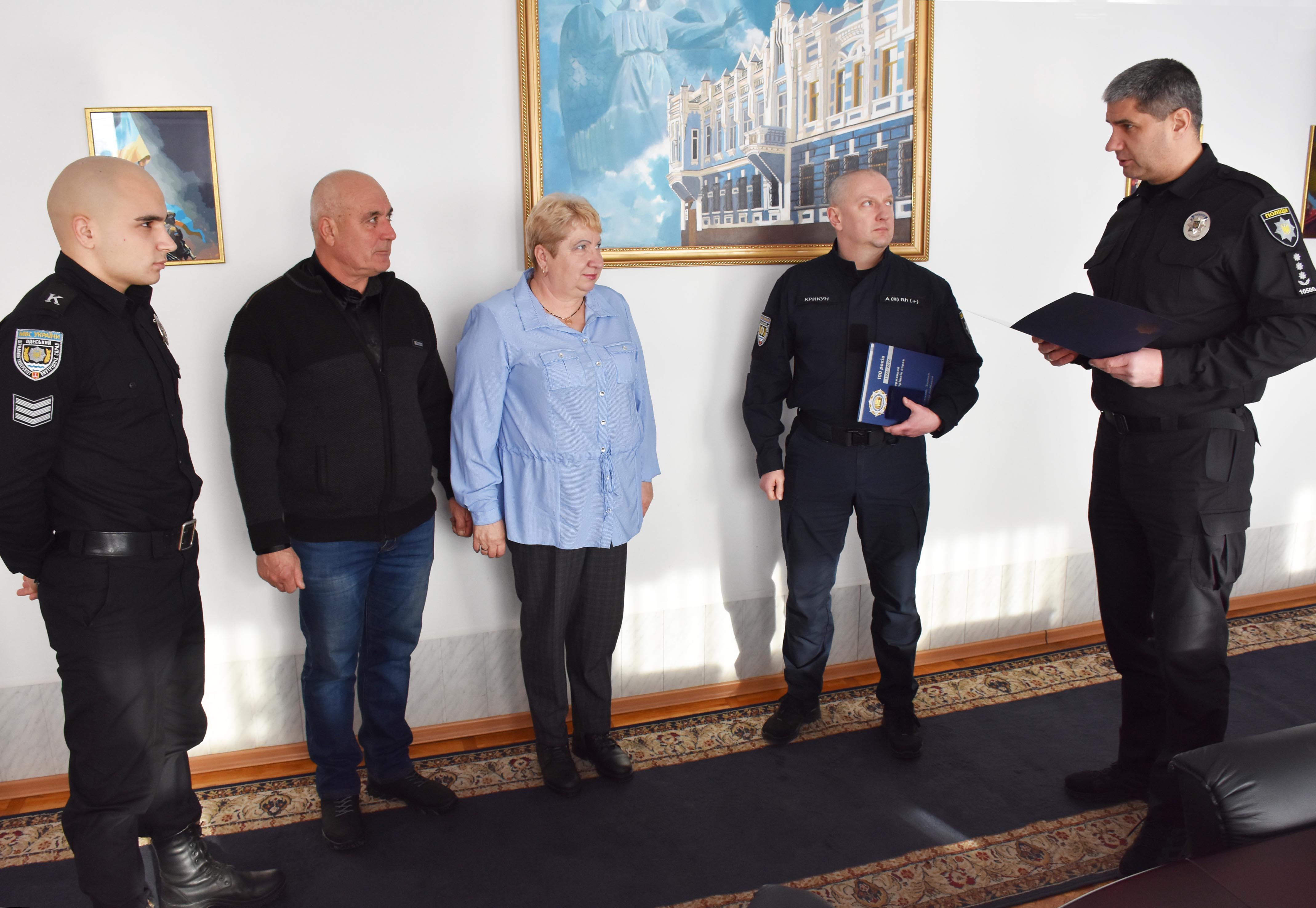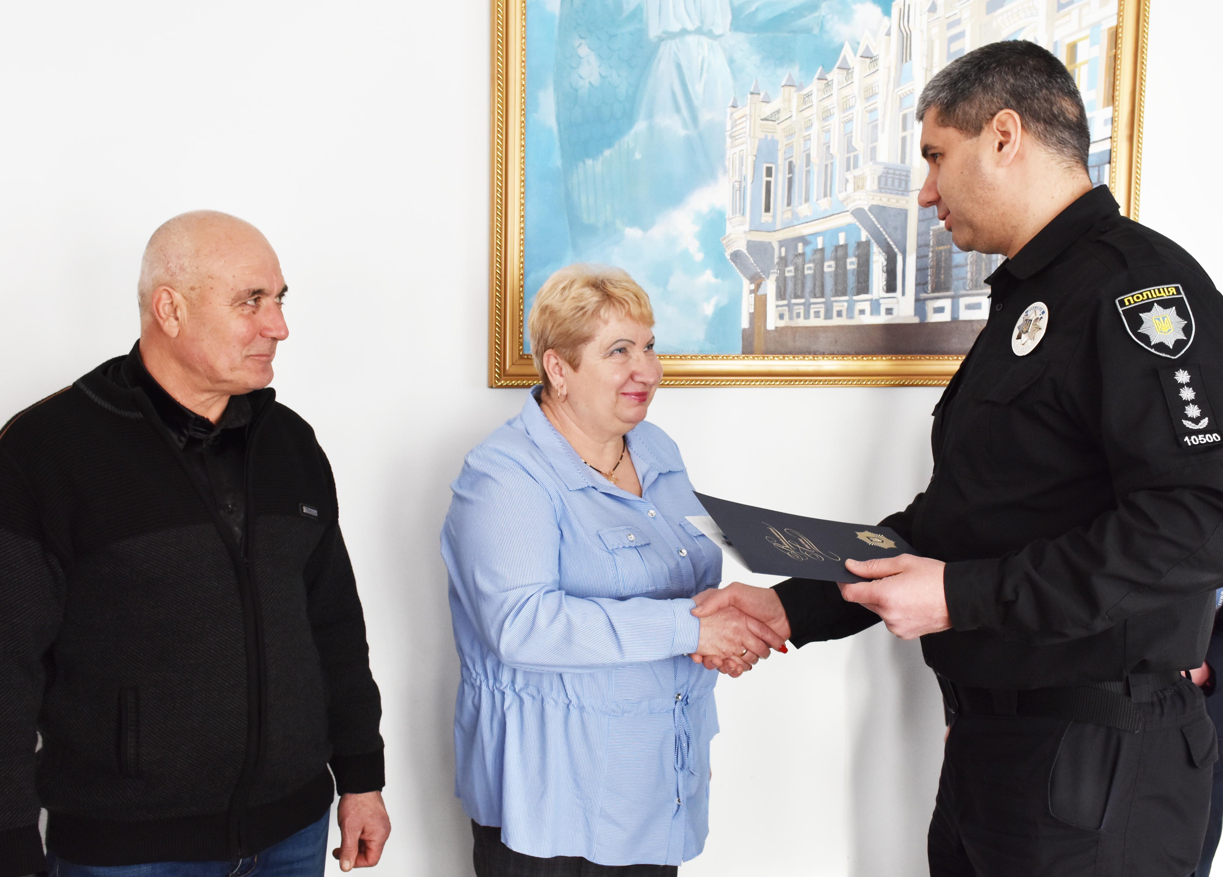 Вони передали Наталії Олександрівні та Вадиму Миколайовичу подячний лист за підписом Міністра внутрішніх справ Дениса Монастирського та пам’ятну відзнаку ОДУВС за гідне виховання сина, який, ризикуючи власним життям, надав допомогу громадянам, що опинилися у небезпечній ситуації.