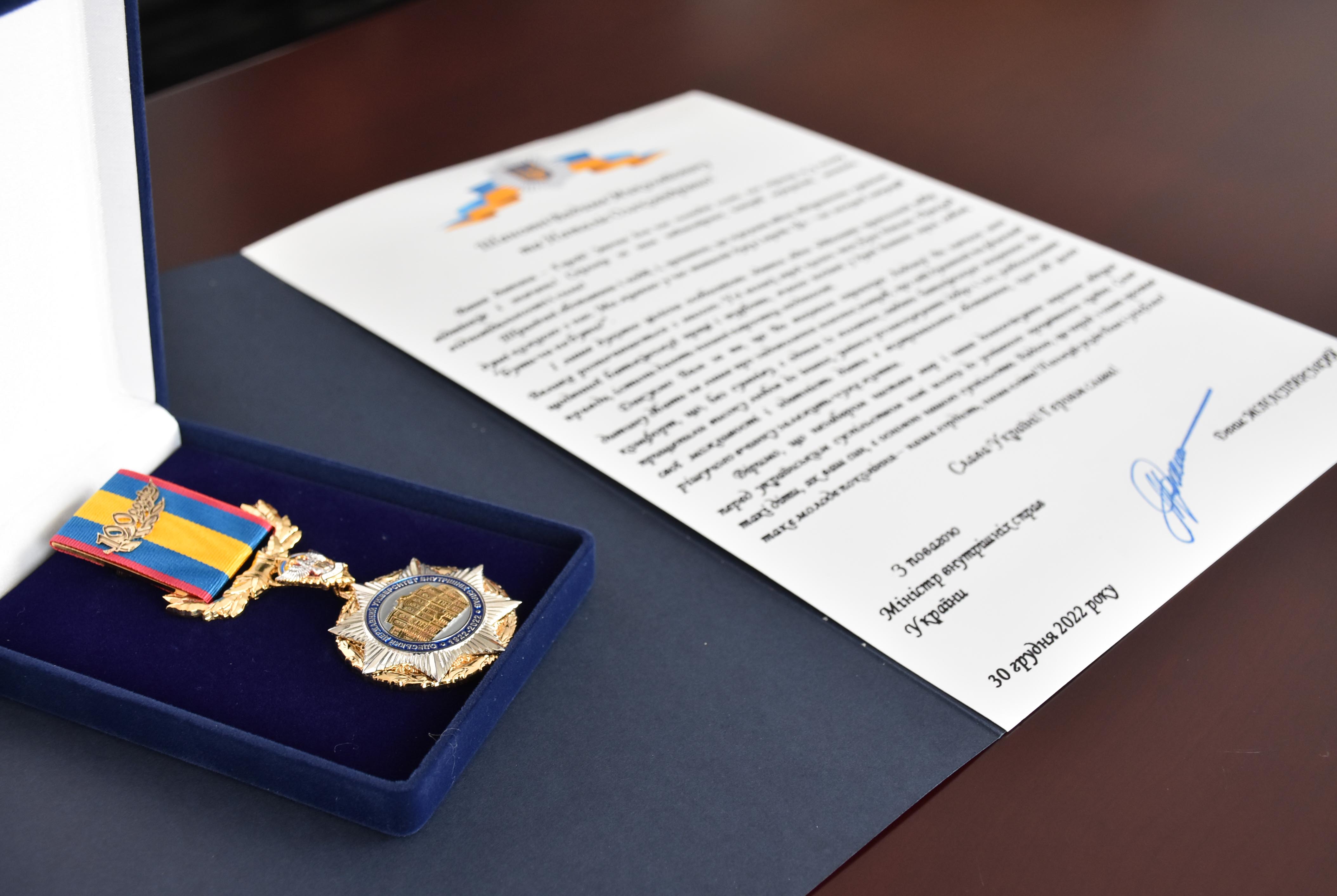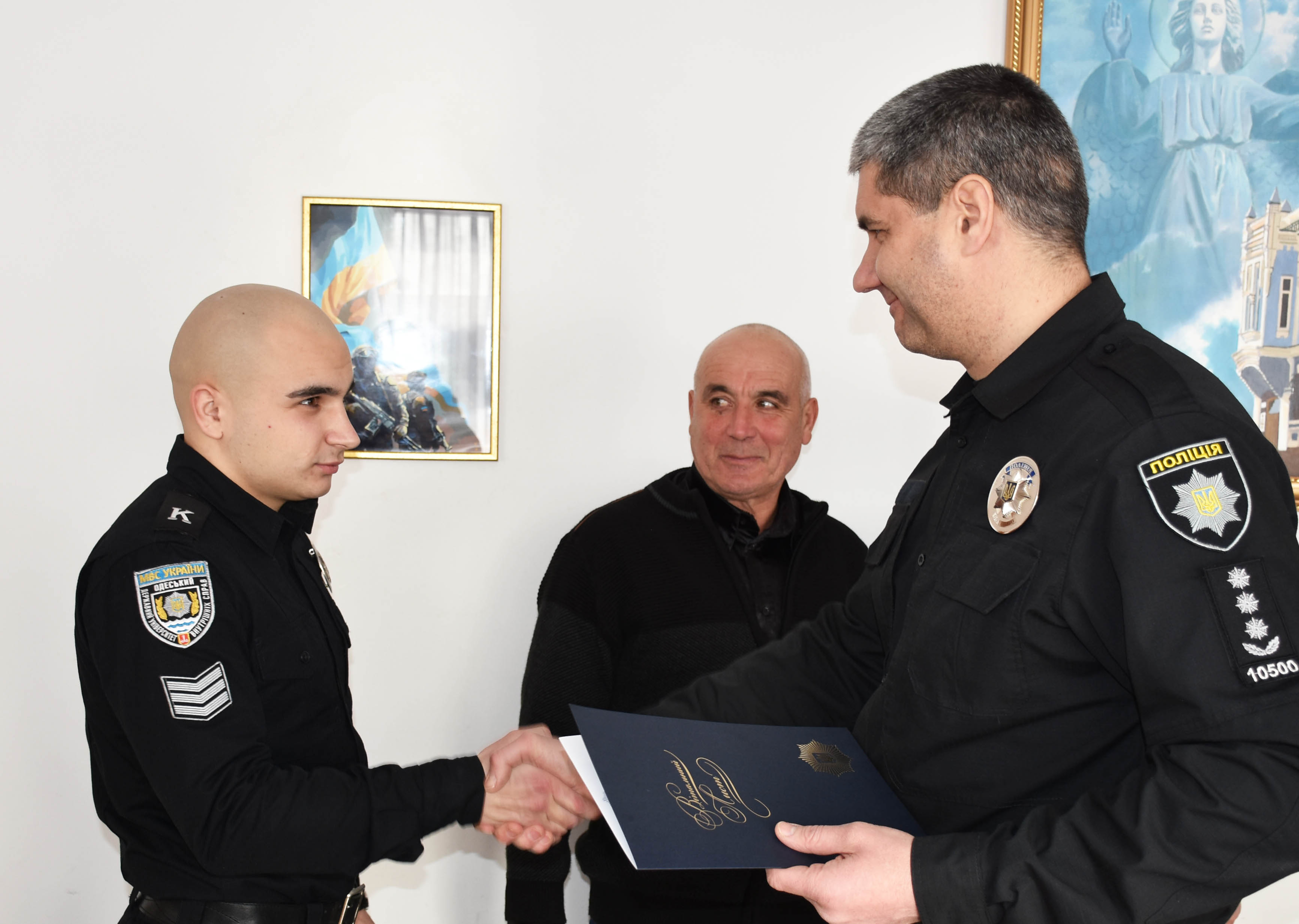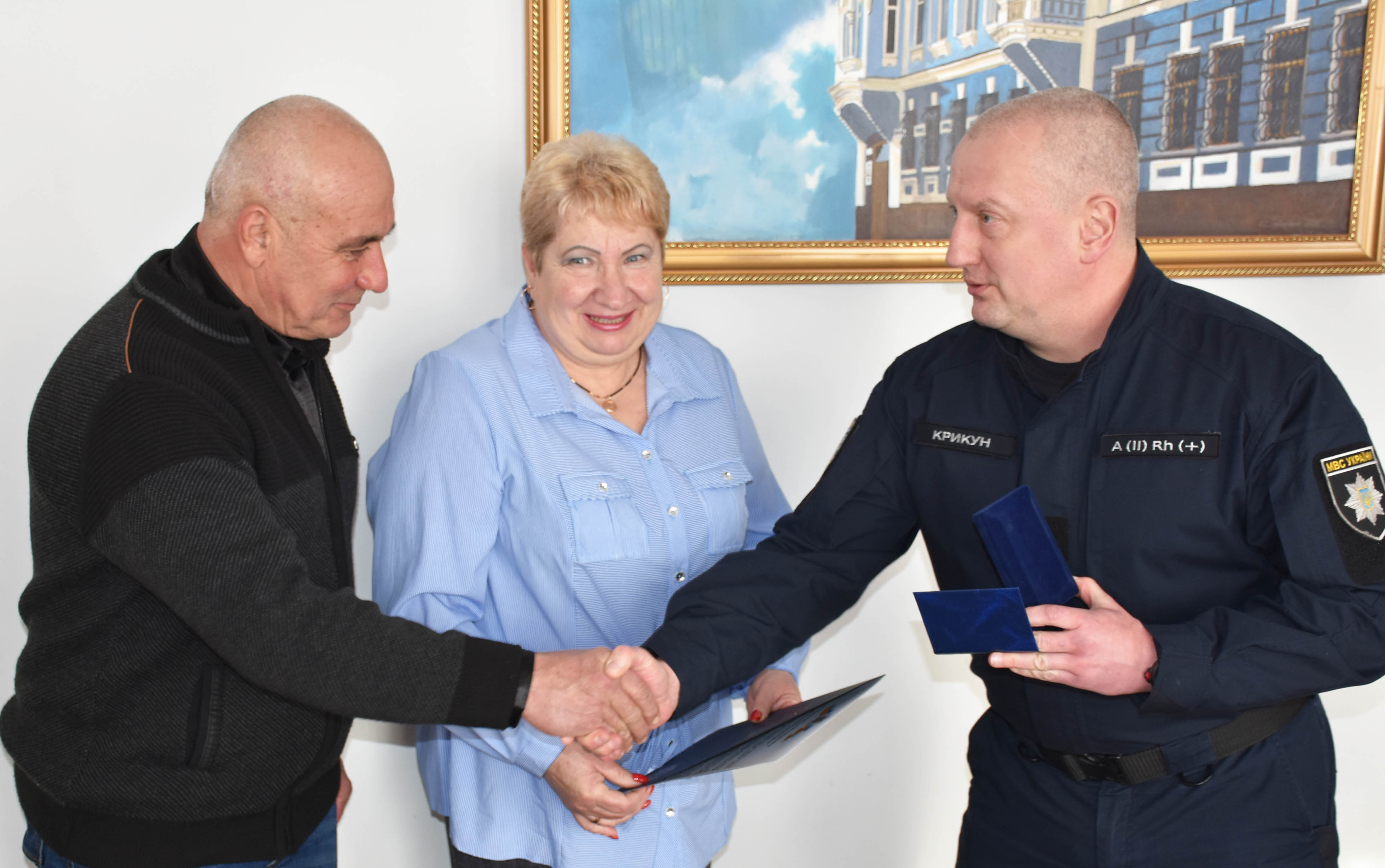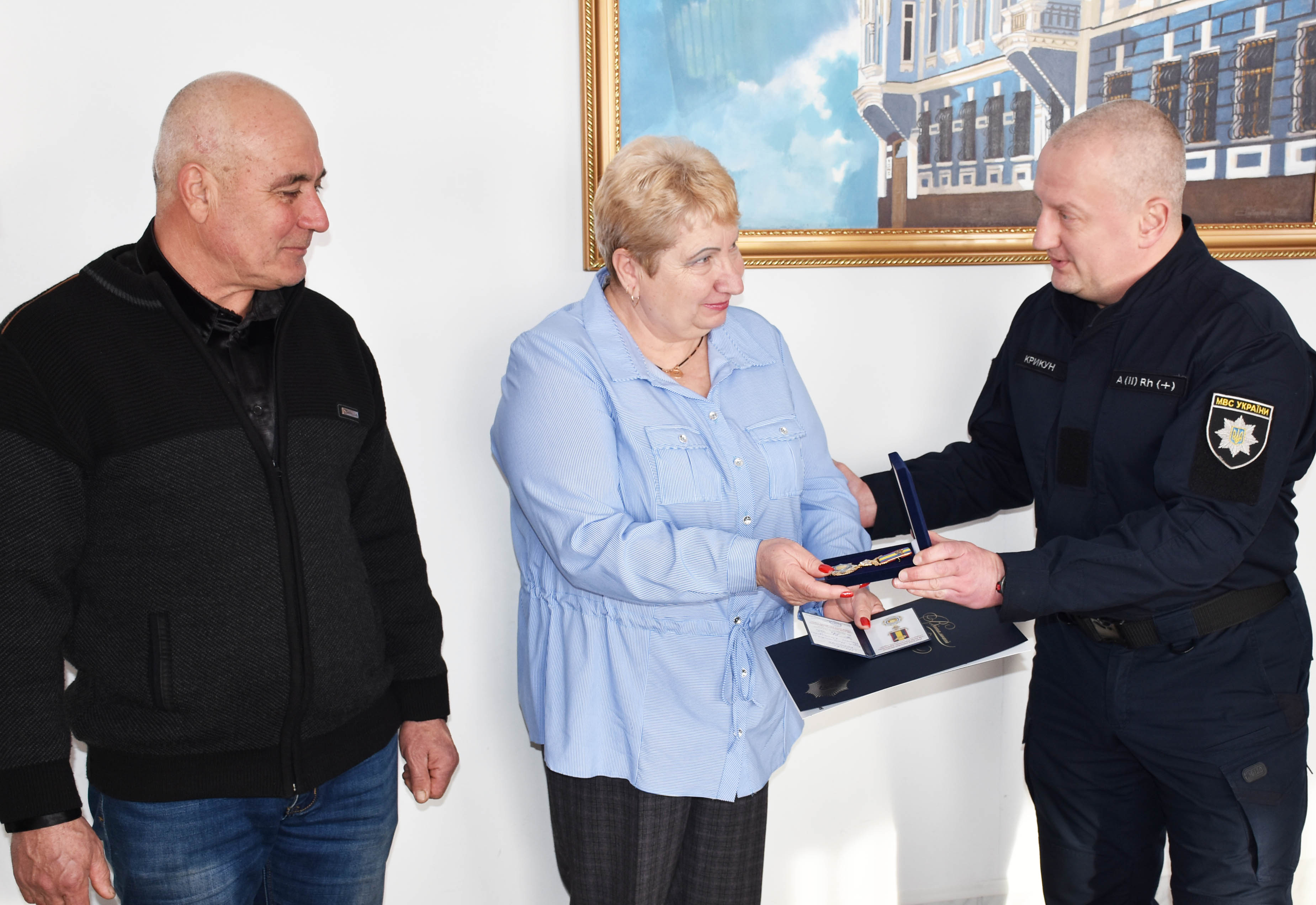 Вони передали Наталії Олександрівні та Вадиму Миколайовичу подячний лист за підписом Міністра внутрішніх справ Дениса Монастирського та пам’ятну відзнаку ОДУВС за гідне виховання сина, який, ризикуючи власним життям, надав допомогу громадянам, що опинилися у небезпечній ситуації.