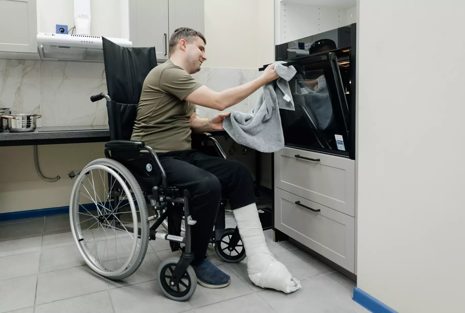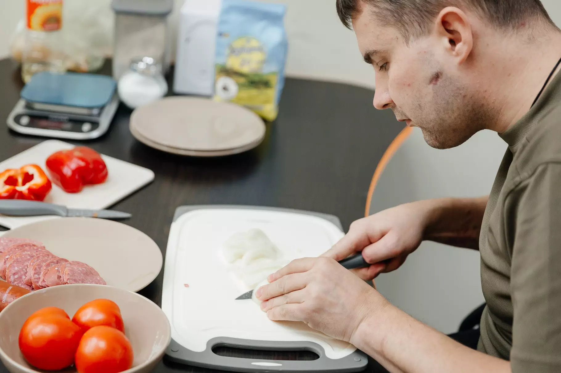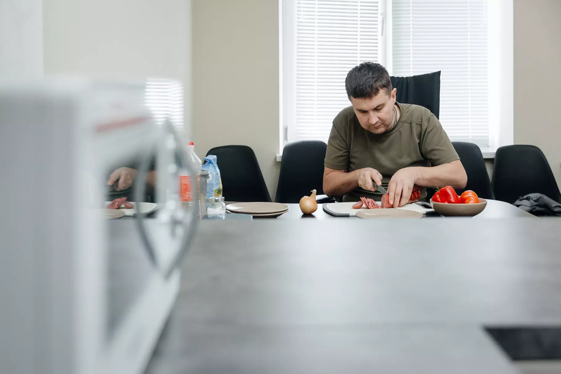 На одному із занять киянин Станіслав, який втратив око та отримав важкі поранення кінцівок на Харківщині, готував піцу, самостійно нарізаючи начинку і розкачуючи тісто.