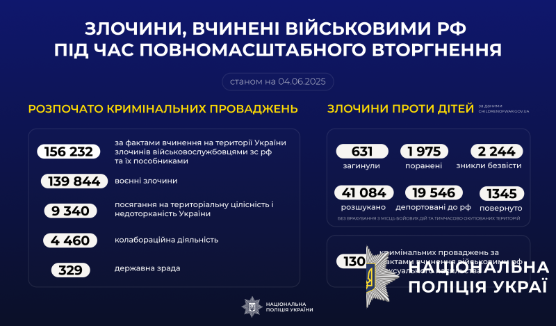 З початку повномасштабного вторгнення росії в Україну слідчі Національної поліції України розпочали 156 232 кримінальних проваджень за фактами вчинення на території України злочинів військовослужбовцями збройних сил російської федерації та їхніми пособниками.