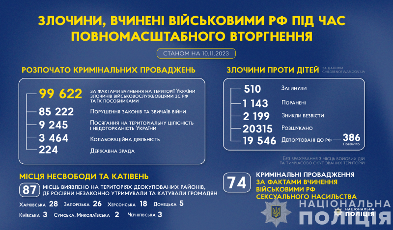 З початку повномасштабного вторгнення росії в Україну слідчі Національної поліції України розпочали 99 622 кримінальні провадження за фактами вчинення на території України злочинів військовослужбовцями збройних сил російської федерації та їхніми пособниками.