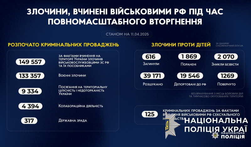 З початку повномасштабного вторгнення росії в Україну слідчі Національної поліції України розпочали 149 557 кримінальних проваджень за фактами вчинення на території України злочинів військовослужбовцями збройних сил російської федерації та їхніми пособниками. З них: 133 357 – за ст. 438 Кримінального кодексу України (Воєнні злочини) 9 334 – за ст. 110 Кримінального кодексу України (Посягання на територіальну цілісність і недоторканність України) 4 394 – за ст. 111-1 Кримінального кодексу України (Колабораційна діяльність) 317 – за ст. 111 Кримінального кодексу України (Державна зрада) та ін.