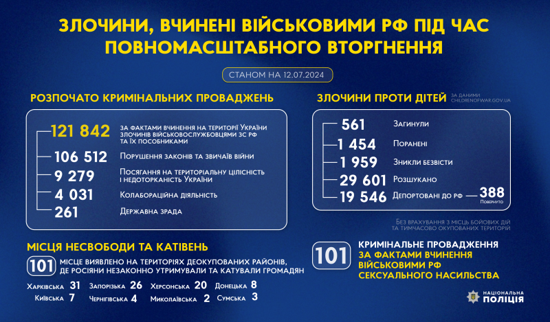 З початку повномасштабного вторгнення росії в Україну слідчі Національної поліції України розпочали 121 842 кримінальних проваджень за фактами вчинення на території України злочинів військовослужбовцями збройних сил російської федерації та їхніми пособниками.