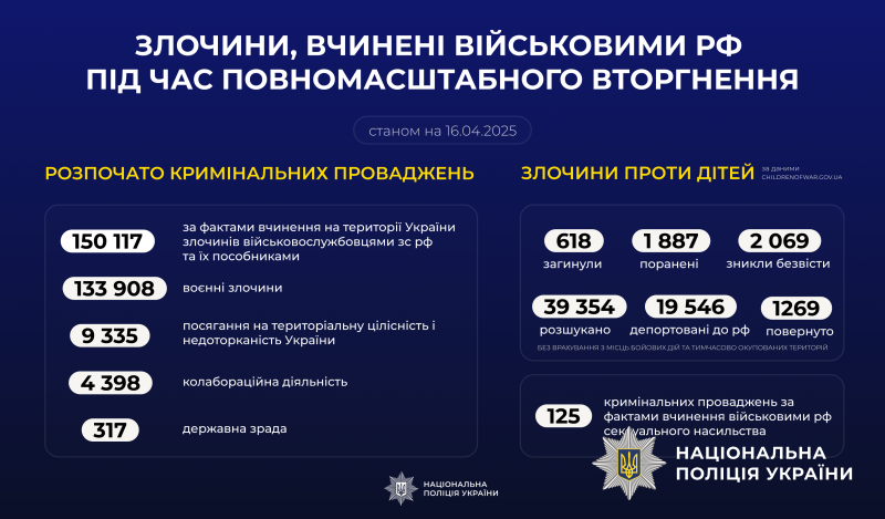 З початку повномасштабного вторгнення росії в Україну слідчі Національної поліції України розпочали 150 117 кримінальних проваджень за фактами вчинення на території України злочинів військовослужбовцями збройних сил російської федерації та їхніми пособниками.