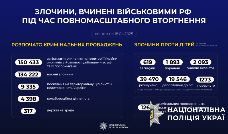 З початку повномасштабного вторгнення росії в Україну слідчі Національної поліції України розпочали 150 433 кримінальних проваджень за фактами вчинення на території України злочинів військовослужбовцями збройних сил російської федерації та їхніми пособниками.
